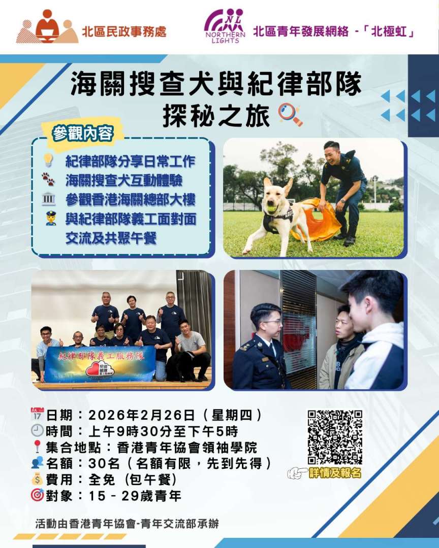 你曾否想過,紀律部隊的日常工作是怎樣的? 又或者,好奇那些訓練有素的海關搜查犬,如何在任務中「聞」出真相及危險品?👮♂️🐶 機會來啦! 北區青年發展網絡「北極虹」誠摯邀請區內青年一同參與 💫《海關搜